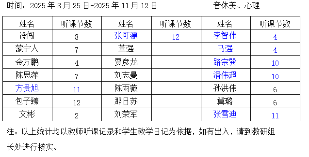 通辽五中教师听课情况记录单{初中部音体美、心理}