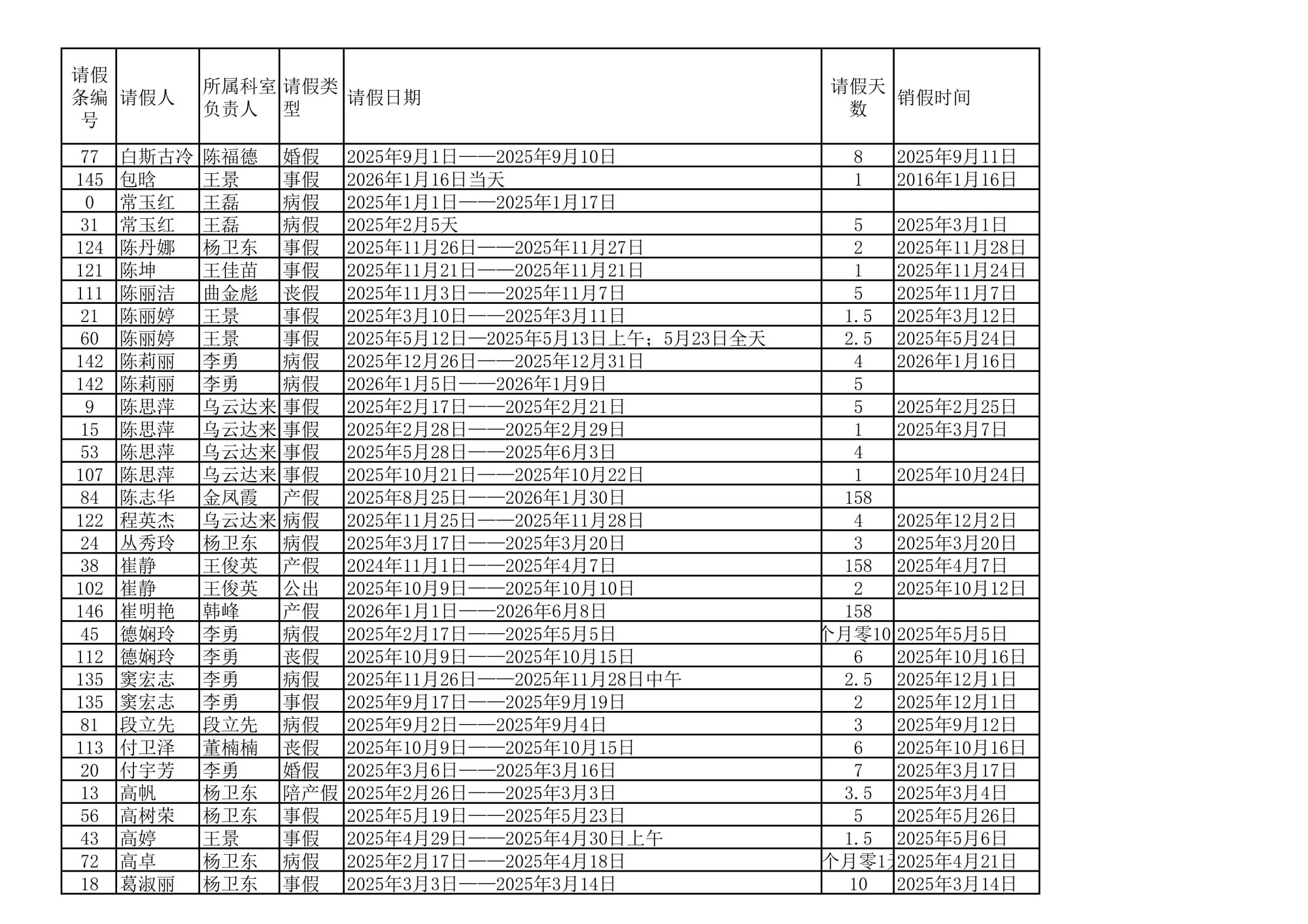 请未上交假条的教职工在2026年1月23日前上交假条,公示的表格中的最后一栏“销假时间”就是教职工的到岗时间,销假时间如果是空白且本人已经到岗上班的教职工,请在2026年1月23日前到人事科领取假条并销假。